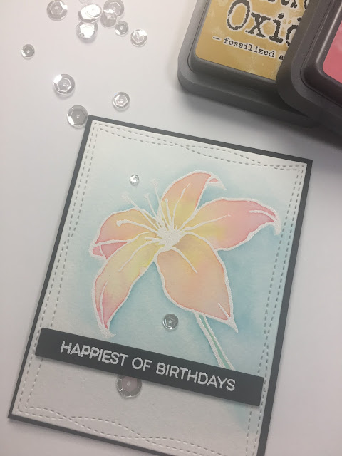I used Canson XL Watercolor paper and one of my new Concord & 9th stamps. I embossed the flower image with white embossing powder, smoothed the ink colors onto my craft mat and started adding color. I realize you can't tell in the picture but the colors blended so softly. They almost have a milky finish.